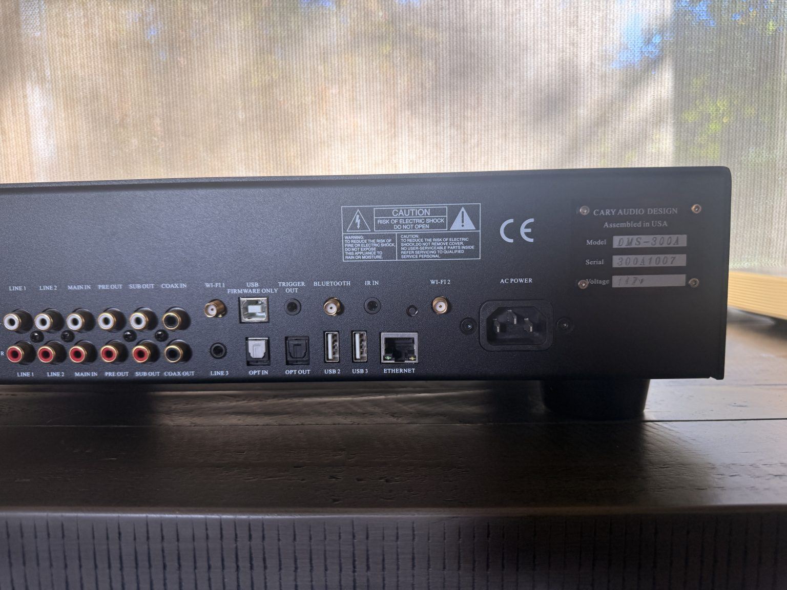The Cary DMS 300A has three RCA analog inputs as well as pre-out jacks to use the 300A as a preamp. There is also a subwoofer out for adding a sub. There is a coax digital in and out as well as an optical input and output. There is a USB 2 and 3 input and an ethernet input for hooking up your router. There is also a wifi antenna and bluetooth antenna.